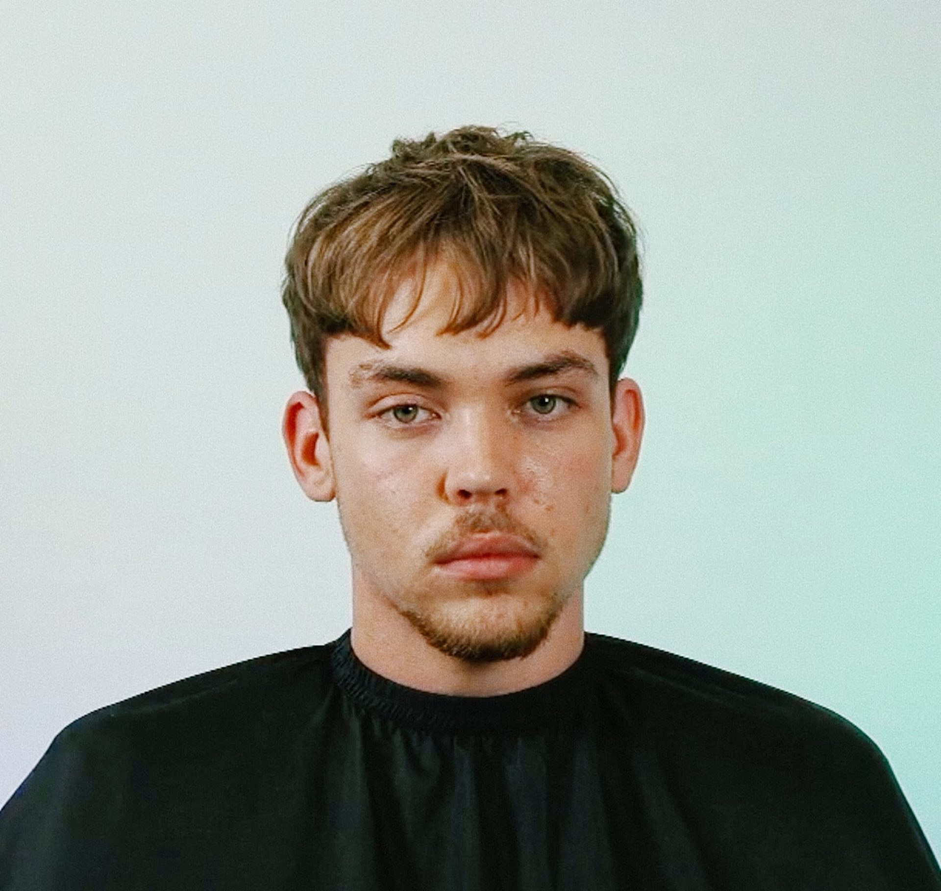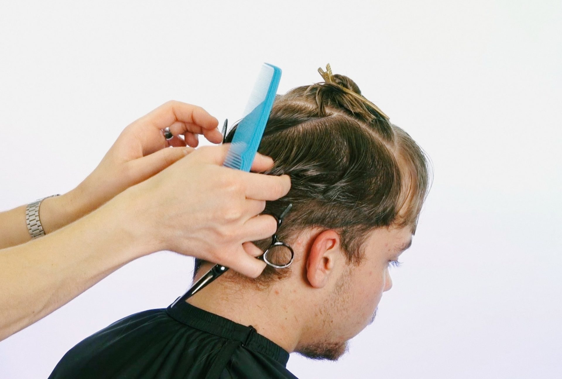 Kurs zaczyna się od konsultacji z Karolem i sekcjonowania głowy według anatomii – linia przez wypukłość skroni i wyrostek sutkowaty, oddzielona sekcja grzywki, trójkąt z góry. Pierwsza linia wyznaczona jest na grzywce w technice linii, tuż nad brwiami, delikatnie po kole. Od tej linii Andrzej przenosi długość przez pasmo pamięci na kolejne sekcje, kontrolując jednocześnie uniesienie i kąt – w zależności od punktu odniesienia cięcie daje raz gradację, raz warstwy. Góra łączy się z bokami przez dyskoneksję, którą na koniec wiąże kształtem okrągłym wertykalnie i kwadratowym horyzontalnie.