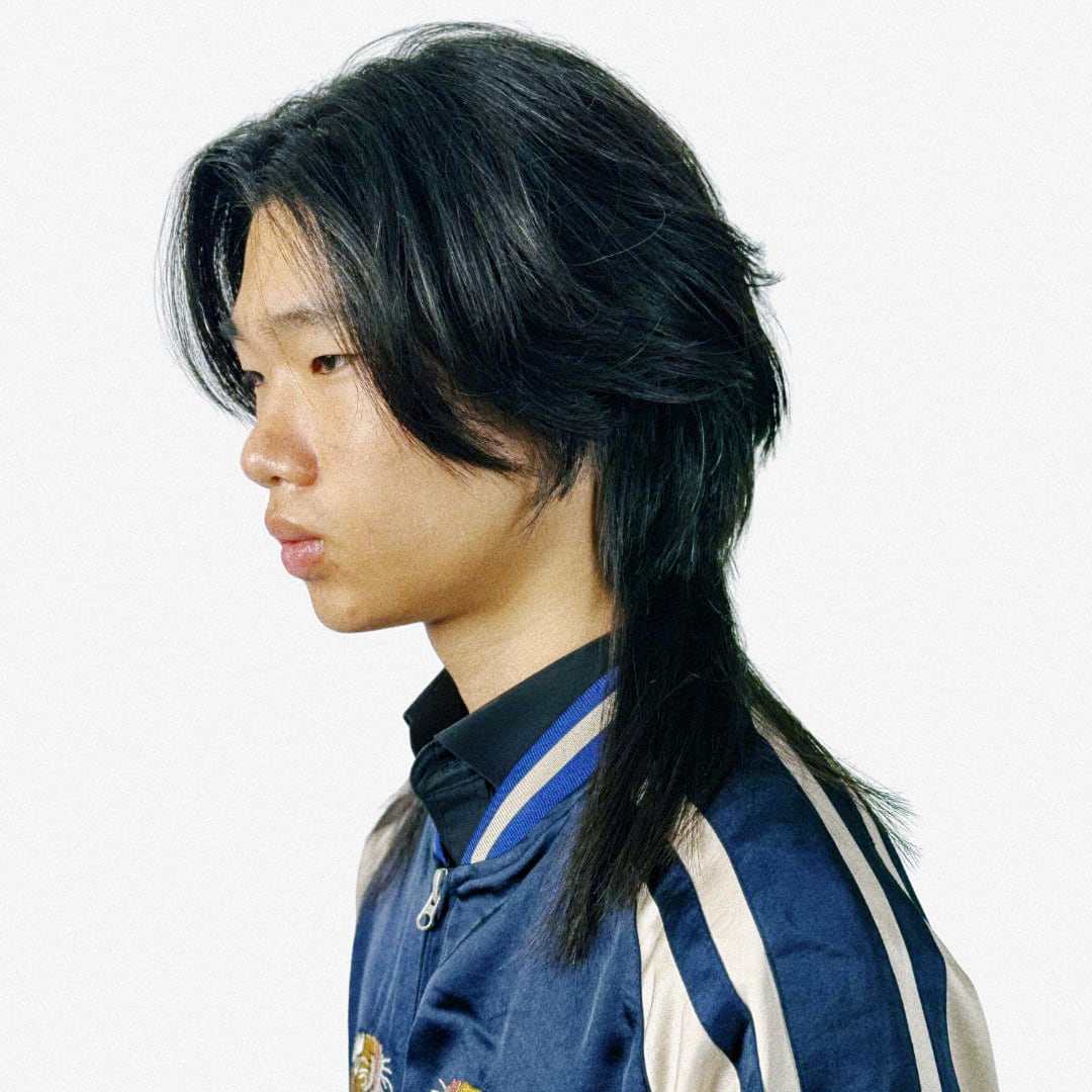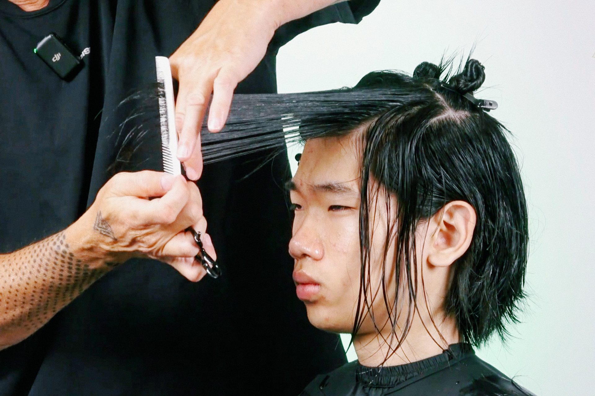 Kamil pracuje na grubych, prostych włosach azjatyckich — typ, który wyraźnie pokazuje każde cięcie i nie wybacza niedokładności. Tył strzyżony jest w linii prostej z maksymalną długością. Górna część potyliczna, boki i góra — wszystko w kwadracie, horyzontalnie i wertykalnie, z przekierowaniem pasm budującym objętość w naturalnych zaokrągleniach głowy. Sekcja skroniowa pracuje diagonalnie — kształt określa linia łuku brwiowego i kości policzkowej. Między tymi elementami powstaje mocna dyskoneksja, która definiuje charakter całej fryzury.