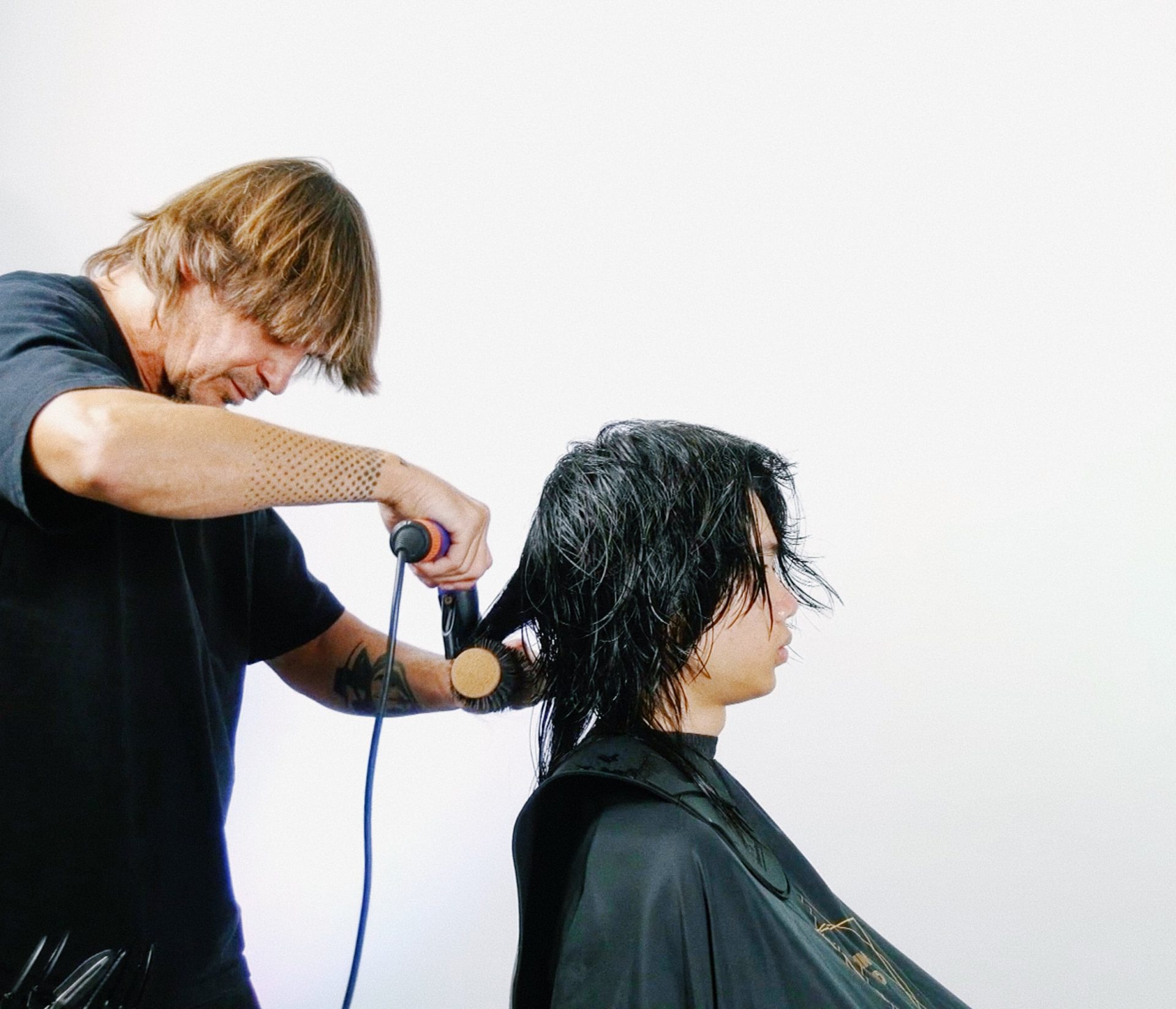 Kamil celowo nie używa technik teksturyzacji w trakcie strzyżenia — stawia na cięcie na tempo i point cut pod stałym kątem 45°, żeby uzyskać czystą linię zewnętrzną z kontrolowaną teksturą wewnętrzną. Dopiero po zbudowaniu kształtu i długości decyduje, ile tekstury faktycznie potrzeba. To podejście, które daje dużo kontroli i pozwala uniknąć najczęstszego błędu w wolf cutach — zbyt miękkiej, „damskiej” grzywki i chaotycznej formy.